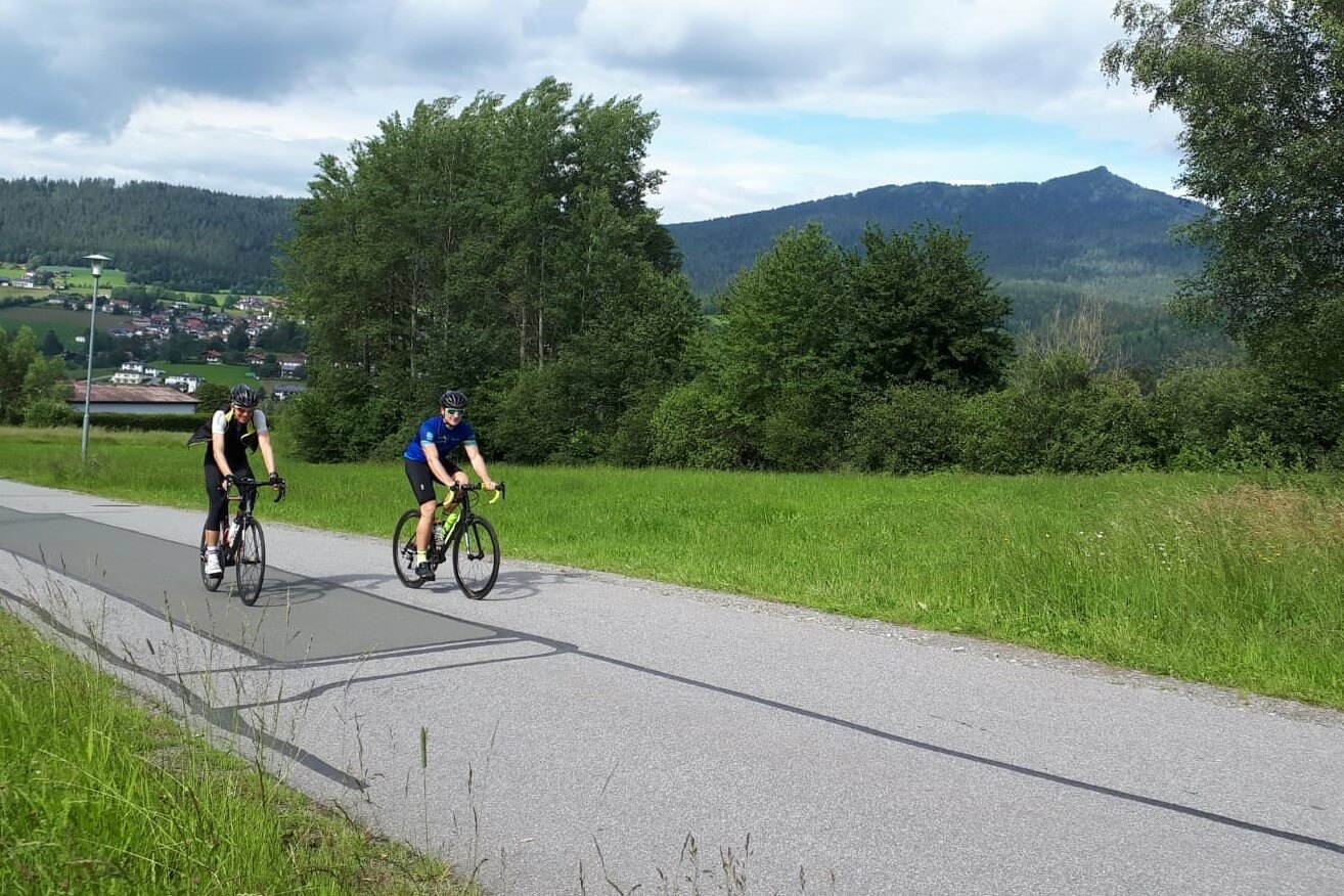 Die skeptischen Blicke der Nachbarn, wandeln sich zu Beifall. „Neuer Rekord!“, schreit mir Ulli zu und lacht. Ich bin jetzt seit gut 9 Stunden unterwegs und doch nicht weg von Zuhause. In jeder Runde treffe ich meine Liebsten. Meine Tochter Lina fährt auch ein paar Meter mit. Immer wieder kommt ein netter Spruch aus der Nachbarschaft. Johannes verabschiedet sich. Er macht satte 3000 Höhenmeter voll und ist zu Recht mächtig stolz darauf. Ich bin froh, dass er so lange mitgeradelt ist. Daniel fährt noch zwei Anstiege mit, bevor er seinen Rückweg nach Bad Kötzting antritt. Und, wie im fliegenden Wechsel, steht auch schon Michi als nächster Begleiter parat – nicht geplant, aber perfekt getimed.