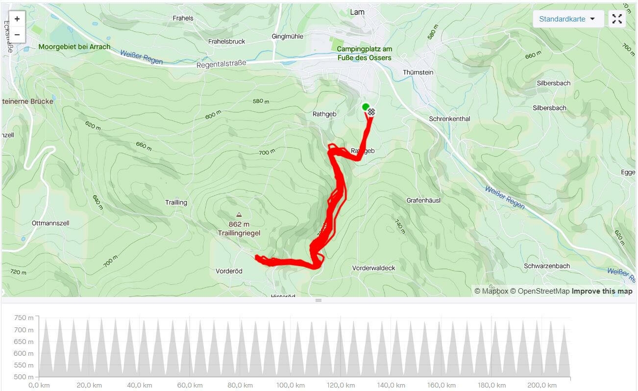Um mir das Vorhaben zumindest aus logistischer Sicht so einfach, wie möglich zu machen, startet meine Strecke direkt vor meiner Haustür rauf zu den Einödhöfen bei Lam. Pro Runde lassen sich damit 234 Höhenmeter auf 5,4 Kilometer sammeln. Um auf 8848 Höhenmeter zu kommen, muss die Runde 37,8 Mal bewältigt und 204 Kilometer zurückgelegt werden.